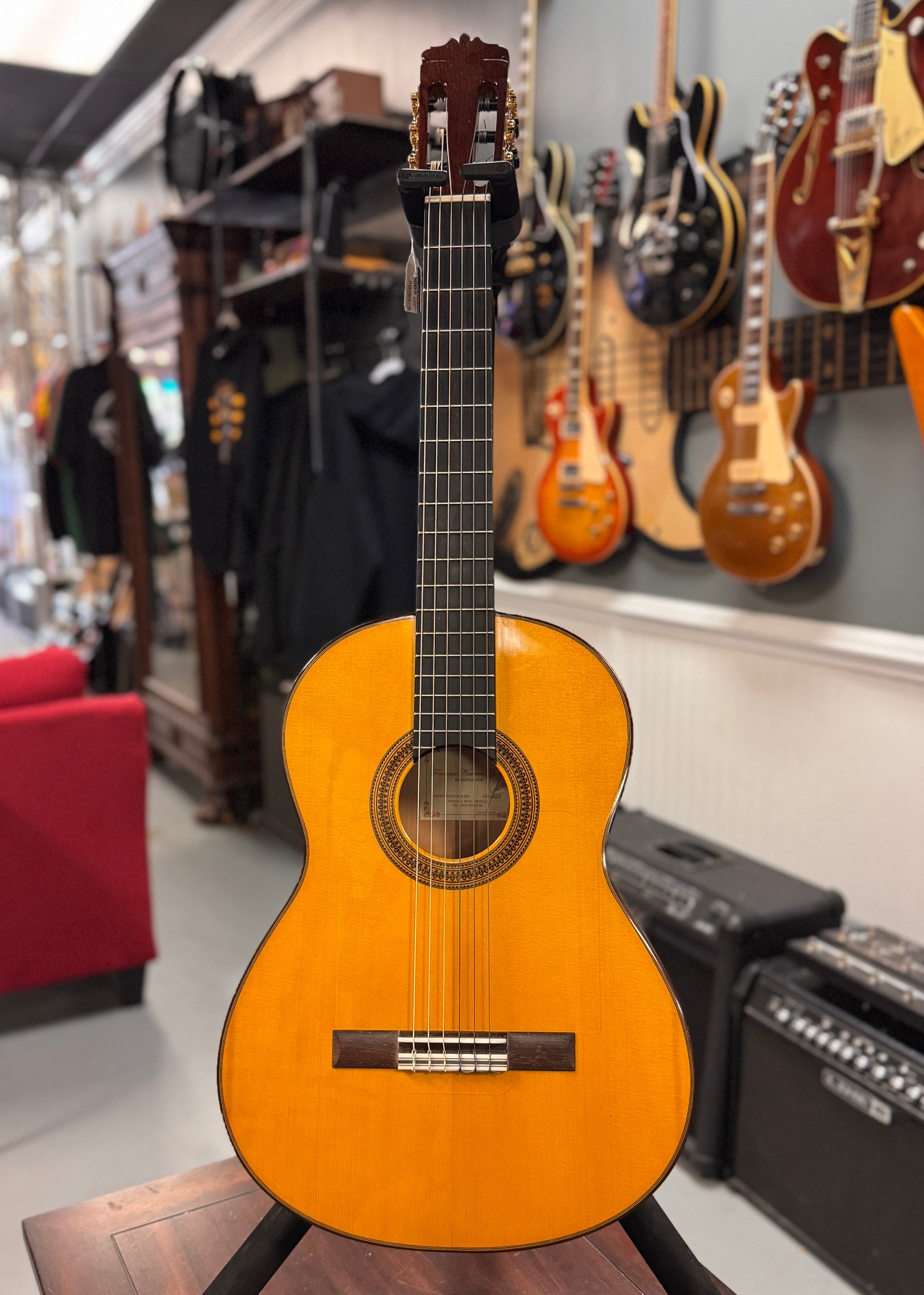 "These Guitars are made by Francisco’s son, Marlon, with Francisco’s oversight. They have a Solid Spruce Top, and Solid Cypress Back and Sides (Blanca)... Cocobolo Bridge and Fretboard. Bone Nut and Saddle. The Guitar has a Standard 650mm Scale Length, and a 52mm Nut Width. Excellent Tone and Playability. Nice Low Action to produce some “growl” when pushed. Nitrocellulose Lacquer Finish. Comes with a Hard Case."